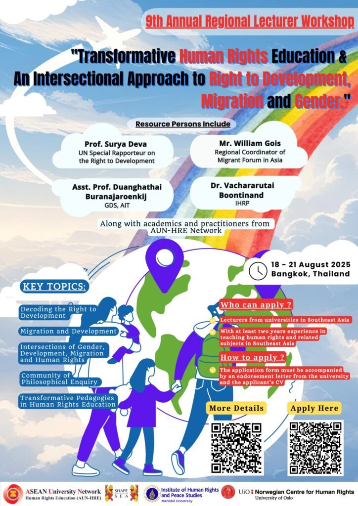 Join us in Bangkok from 18–21 August 2025 for the 9th Annual Regional Lecturer Workshop, focusing on Transformative Human Rights Education & an Intersectional Approach to Right to Development, Migration, and Gender. Organised by AUN-HRE and SHAPE-SEA, this participatory workshop aims to strengthen the capacity of lecturers across Southeast Asia.